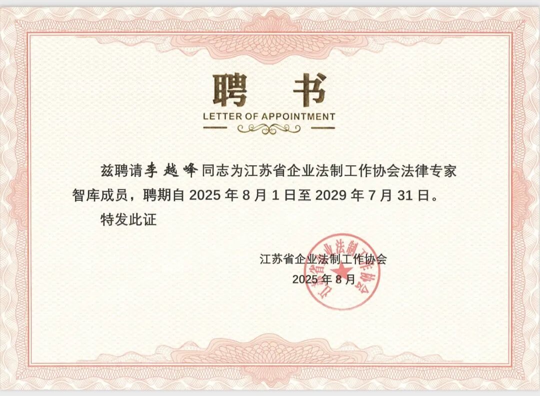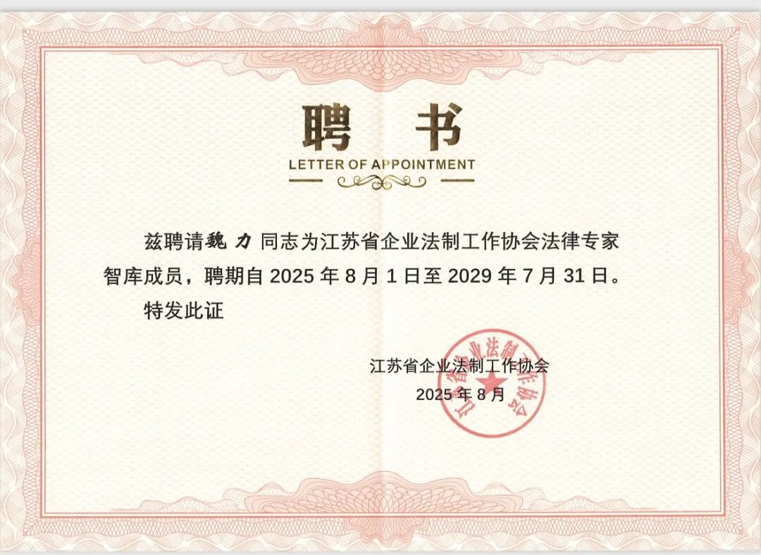 近日,江苏省企业法制工作协会正式发布聘任决定,江苏丰典律师事务所凭借优秀的综合实力、精湛的专业服务与行业内积累的良好口碑,成为江苏省企业法制工作协会会员,并被选举为副会长单位。