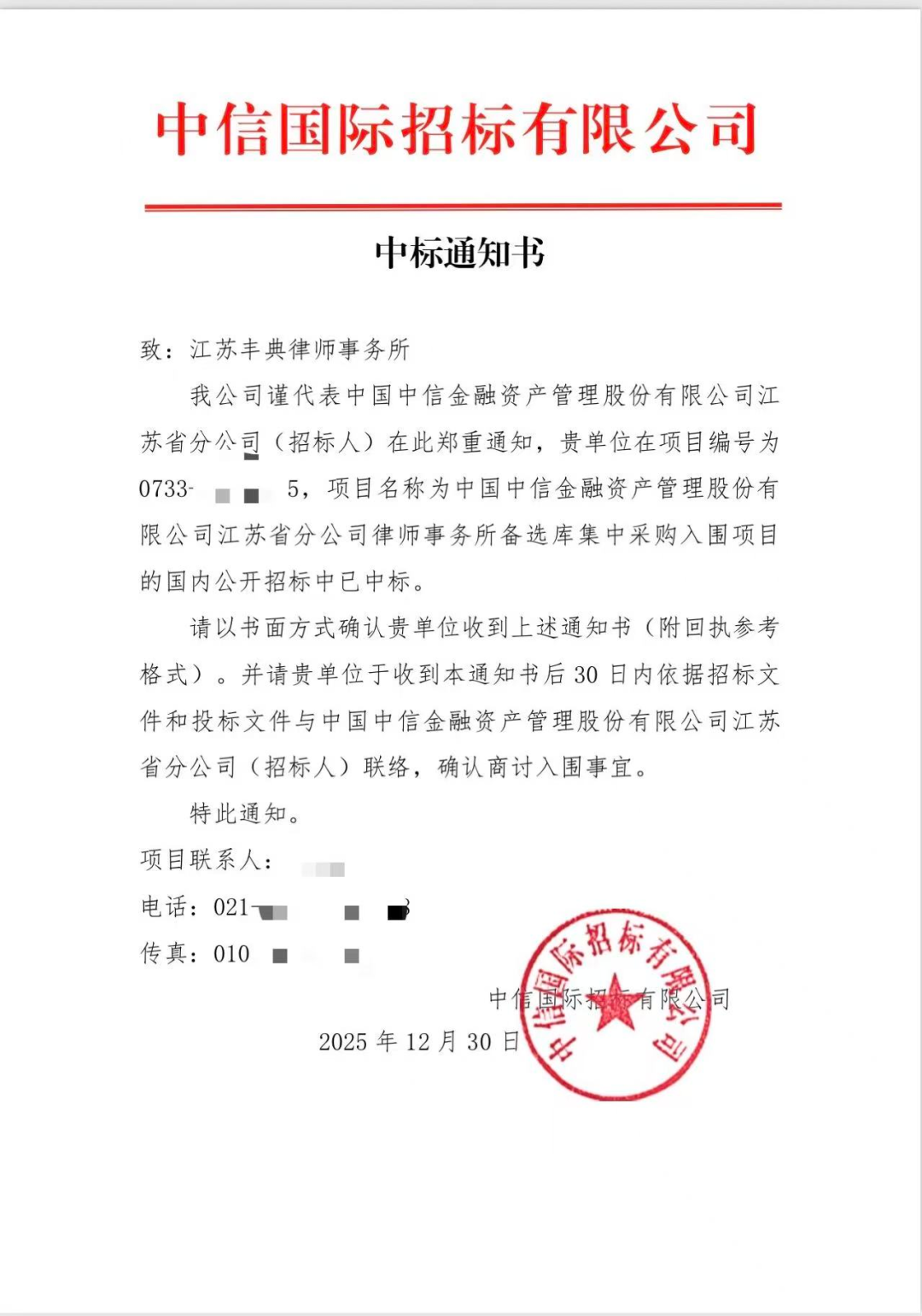 丰典喜讯 :中标中国中信金融资产管理股份有限公司江苏省分公司集中采购律所